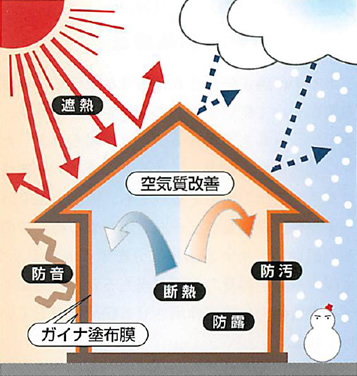 ガイナを家の屋根や壁、内装の塗装に使うと、太陽光や熱や音、汚れを跳ね返します。