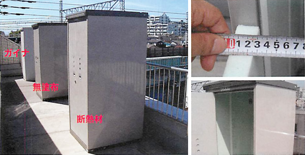 ▲手前から、断熱材物置、無塗布物置、ガイナ塗布の物置(高さ1920mm、幅800mm、奥行900mm)